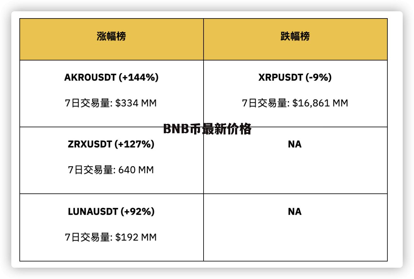 今天我要和大家分享的是關于BNB價格的最新動態(tài)??,在這個數(shù)字貨幣風起云涌的時代,BNB作為幣圈的重要一員,其價格動態(tài)一直備受關注,讓我們一起深入探討B(tài)NB價格的那些事兒吧!